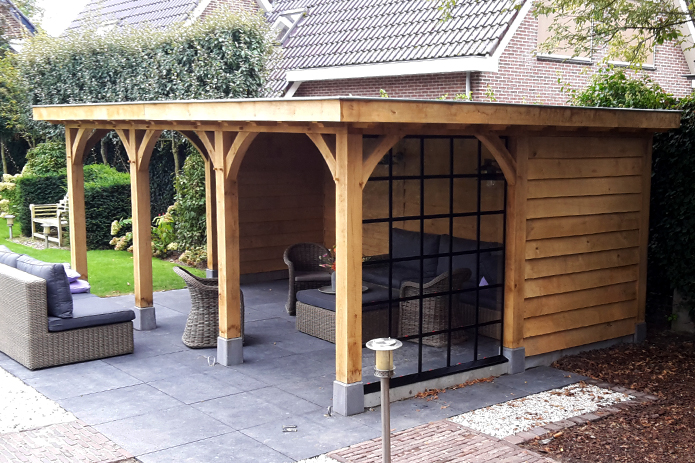 Op deze foto’s ziet u een stalen pui en een bijpassend raampje dat wij geproduceerd en gemonteerd hebben in een prachtig eiken tuinhuis in Barneveld.