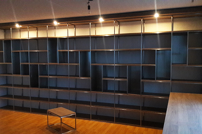 Stalen boekenkast met bureau en kruk. Op maat gemaakt voor een penthouse. RVS en notenhout, een echte eyecatcher! Ook uw project op maat beschikbaar.