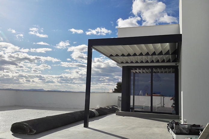 Prachtige alu veranda met vaste louvres in Torrevieja, Spanje! Zonwerend ontwerp, productie en montage op locatie. Wij maken uw ideale zonwering!