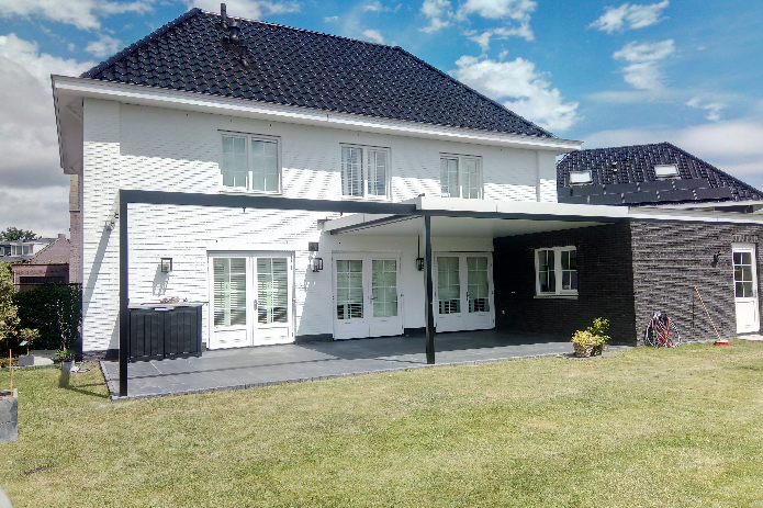 Schitterende 9 meter brede aluminium terrasoverkapping in Vleuten! Deels overdekt, met garage dak integratie. Maatwerk ontwerp en montage!