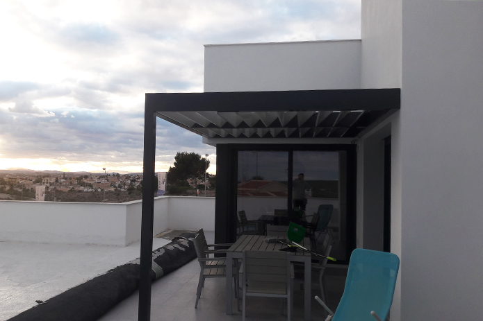 Prachtige klus in Torrevieja, Spanje! Wij bouwden een alu veranda met vaste louvres onder 45 graden, zodat de zon niet direct op het glas staat en huis minder snel warm wordt.